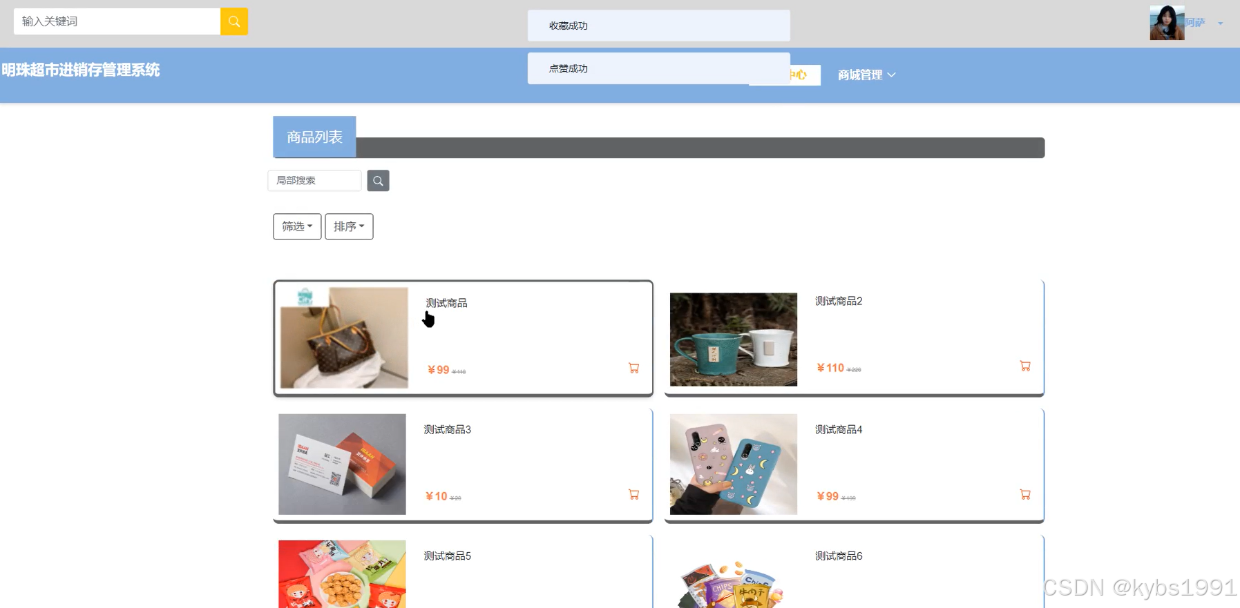 当用户点击明珠超市进销存管理系统中导航栏上的“商品中心”后将会进入到该“商品中心”列表的界面,然后选择想要看的商品信息,点击进入到详细界面,同时可以对该商品进行购买、加购、点赞、收藏、评论等操作。商品中心界面如下图所示。