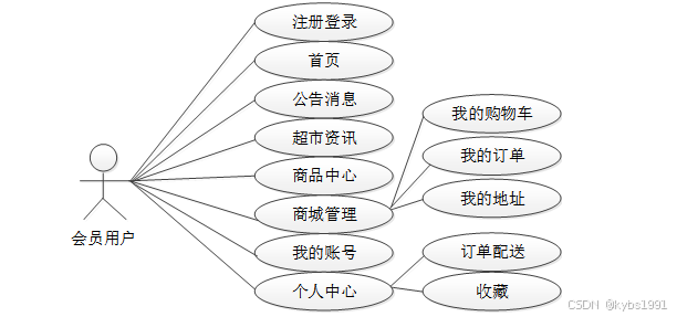 明珠超市进销存管理系统的完整UML用例图分别是图2-1和图2-2。在参与者上包括用户以及管理员。前台上用户角色用例包括用户是首页、公告消息、超市资讯、商品中心、商城管理、我的账户、个人中心,用户角色用例如图2-1所示。