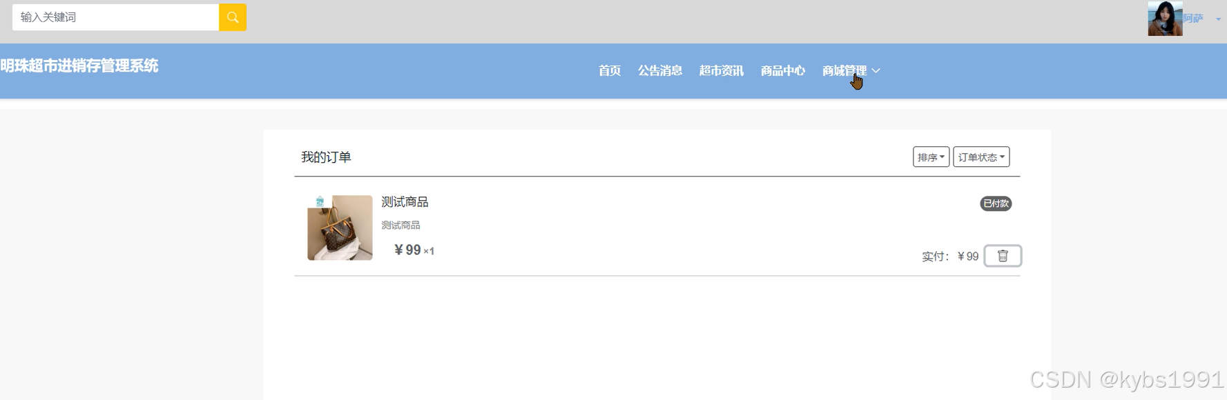 明珠超市进销存管理系统中的管理人员是可以对明珠超市进销存管理系统内的订单列表进行在线发货和管理等,同时支持根据订单号来具体检索商品订单记录信息。订单列表界面如下图所示。