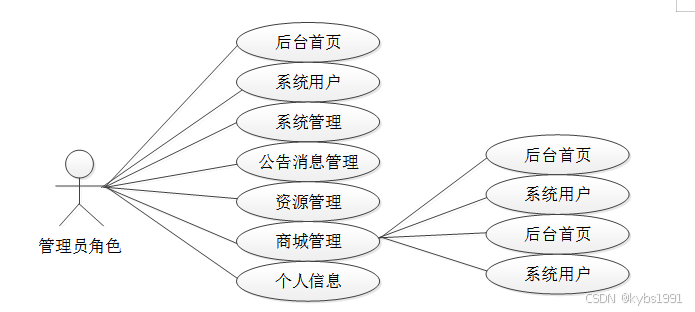 web后台管理上的管理员是维护整个明珠超市进销存管理系统中所有数据信息的,管理员可以进行后台首页、系统用户、系统管理、公告消息管理、资源管理、商城管理、个人信息。管理员角色用例如图2-2所示。
