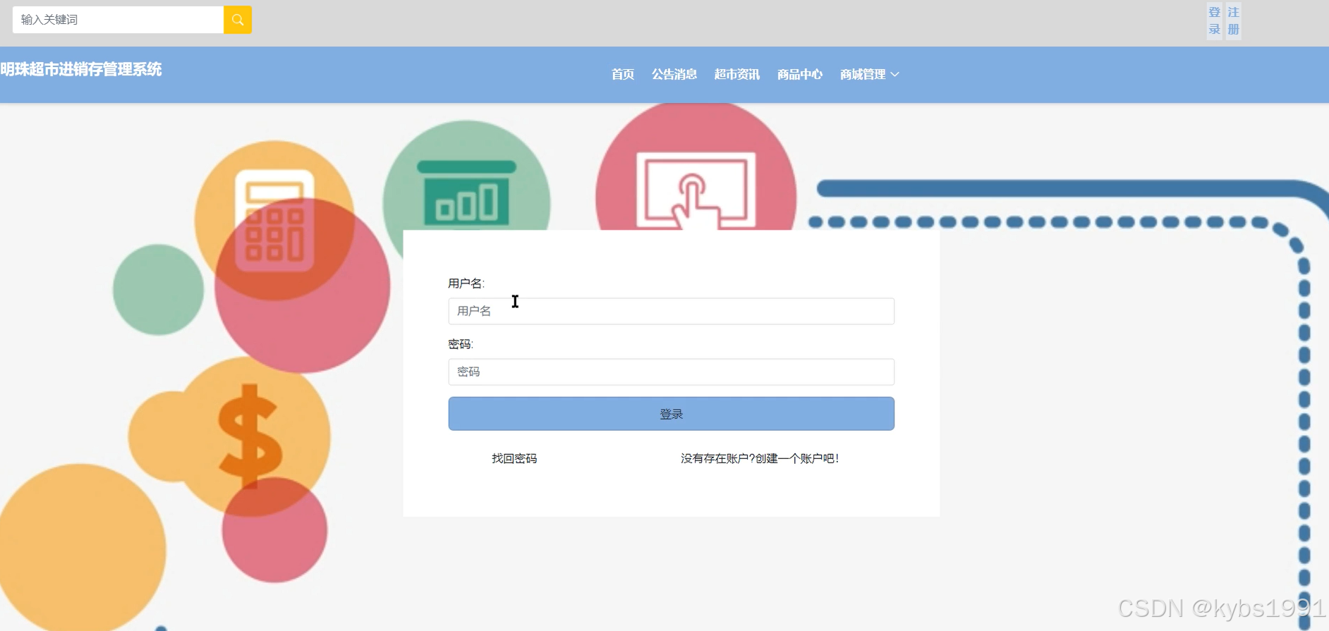 明珠超市进销存管理系统中的前台上注册后的会员是可以通过自己的账户名和密码进行登录的,当会员输入完整的自己的用户名和密码信息并点击“登录”按钮后,将会首先验证输入的有没有空数据,再次验证输入的用户名、密码和数据库中当前保存的用户信息是否一致,只有在一致后将会登录成功并自动跳转到明珠超市进销存管理系统的首页中;否则将会提示相应错误信息,用户登录界面如下图所示。