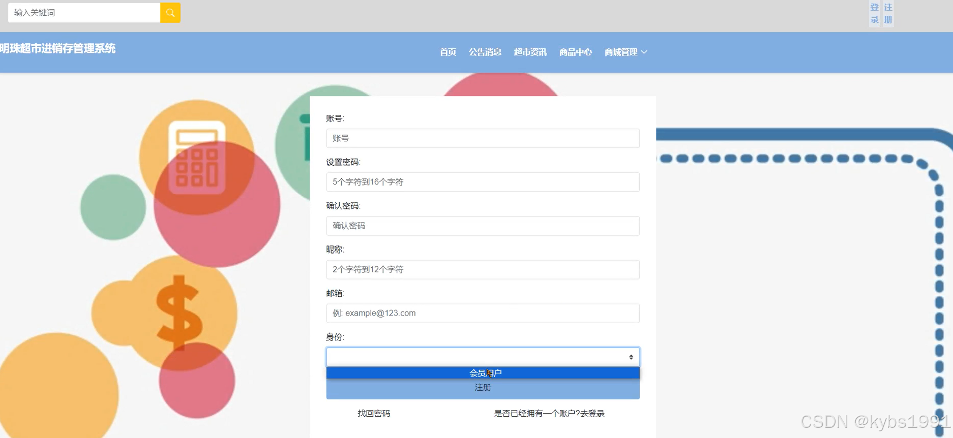 不是明珠超市进销存管理系统中正式会员的是可以在线进行注册的,当填写上自己的账号、密码、昵称、邮箱、身份、姓名、性别再点击“注册”按钮后将会先验证输入的有没有空数据,再次验证密码和确认密码是否是一样的,最后验证输入的账户名和数据库表中已经注册的账户名是否重复,只有都验证没问题后即可会员注册成功。其用会员注册界面展示如下图所示。