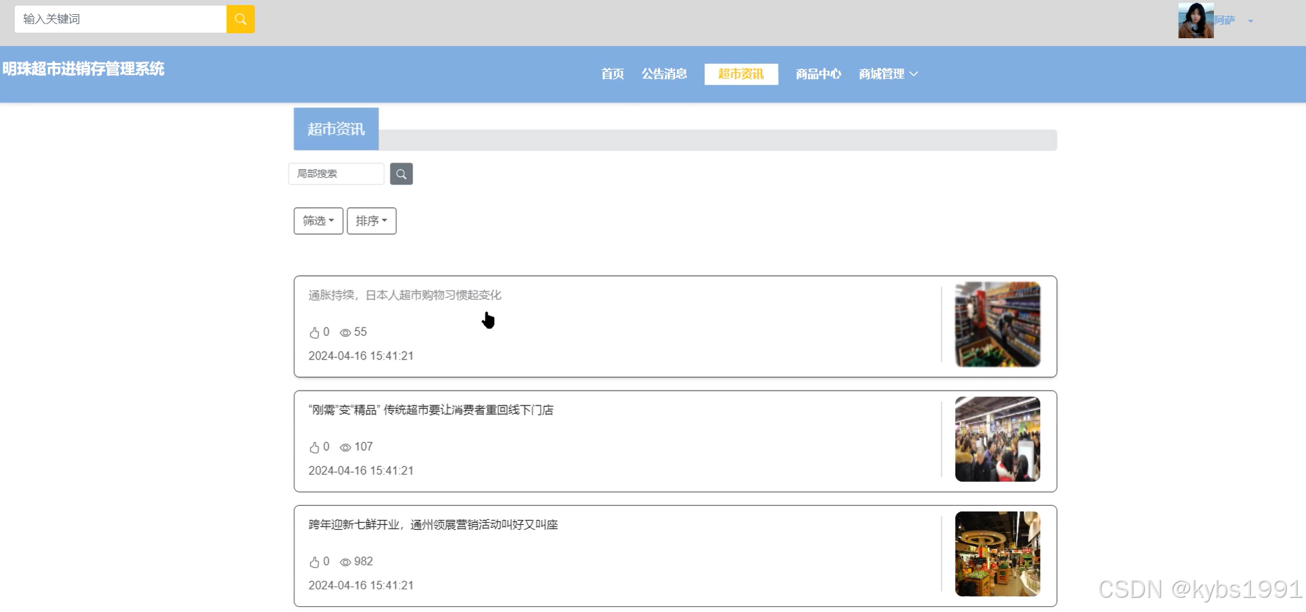 当用户点击明珠超市进销存管理系统中导航栏上的“超市资讯”后将会进入到该“超市资讯”列表的界面,然后选择想要看的超市资讯,点击进入到详细界面,同时可以对该超市资讯进行点赞、收藏等操作。超市资讯界面如下图所示。