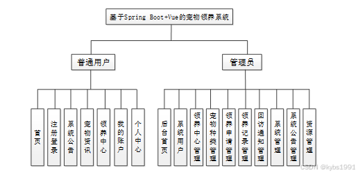 按照基于Spring Boot+Vue的宠物领养系统的角色,主要包括普通用户模块和管理员这两大功能模块。