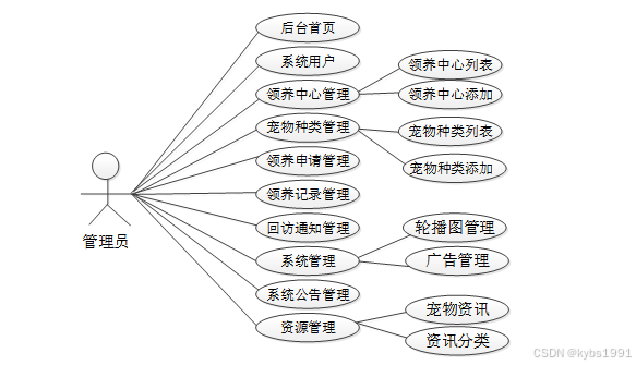 管理员功能主要包括后台首页、系统用户、领养中心管理、宠物种类管理、领养申请管理、领养记录管理、回访通知管理、系统管理、系统公告管理、资源管理。其用例图如下图3-4所示: