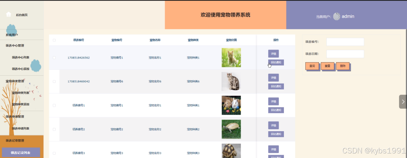 管理员可以查看领养记录列表中某一领养记录详情,点击“回访通知”进入页面填写回访日期、回访内容后点击“提交”即可向领养用户发送回访通知;管理员可以对领养记录列表信息进行查询、重置和删除操作。其界面如下图5-13所示。