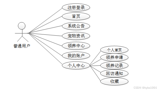 普通用户功能包括注册登录、首页、系统公告、宠物资讯、领养中心、我的(我的账户、个人中心)。其用户用例图如下图3-3所示: