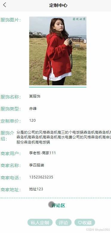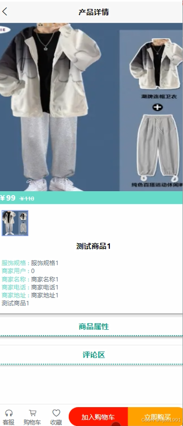 当访客点击了任意商品后将会进入该款商品的详情界面,可以了解到该商品的图片信息、商品信息、价钱信息等,同时可以对该商品进行立即购买+收藏+点赞+评论,商品详情展示页面如图4-6所示。