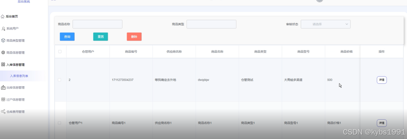管理员可以记录商品的过户信息,包括入库数量、日期、来源等信息的录入和查询。界面如下图所示。
