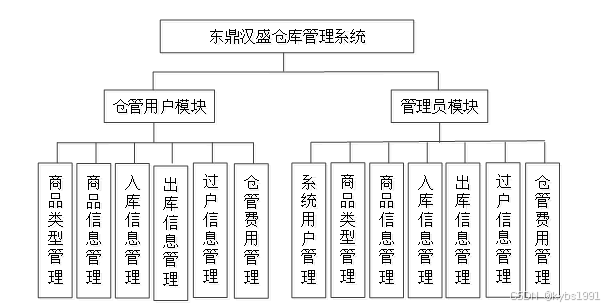 模块包括管理员模块和仓管用户模块,登录进去对应相应的功能,具体的功能模块图:
