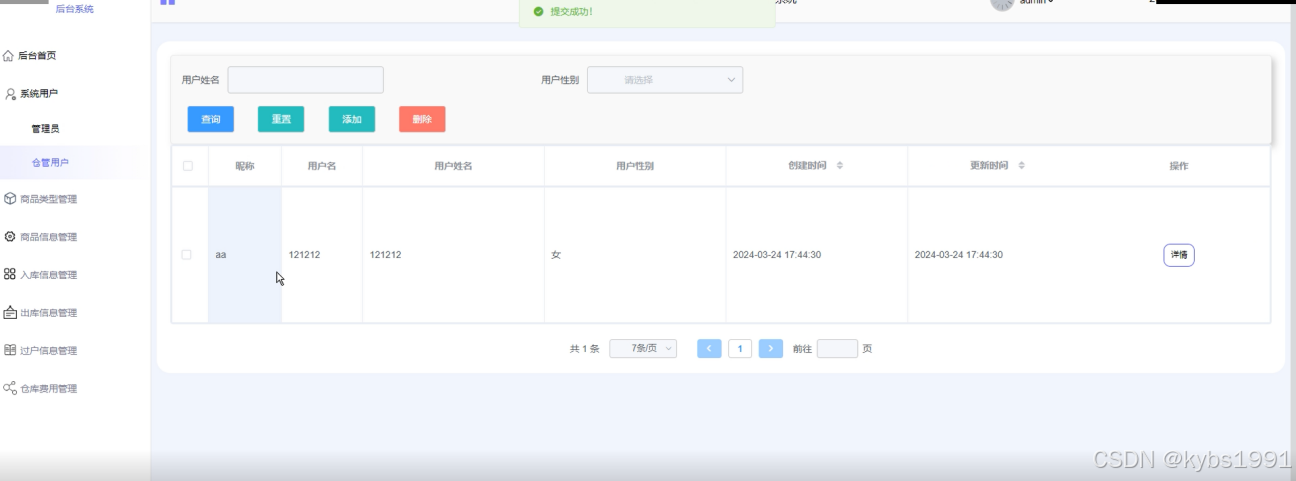 系统用户管理:管理员负责管理系统的用户,包括管理员和仓管用户的登录、权限分配等操作。他们可以添加、编辑或删除用户账户,并设定相应的权限。界面如下图所示。