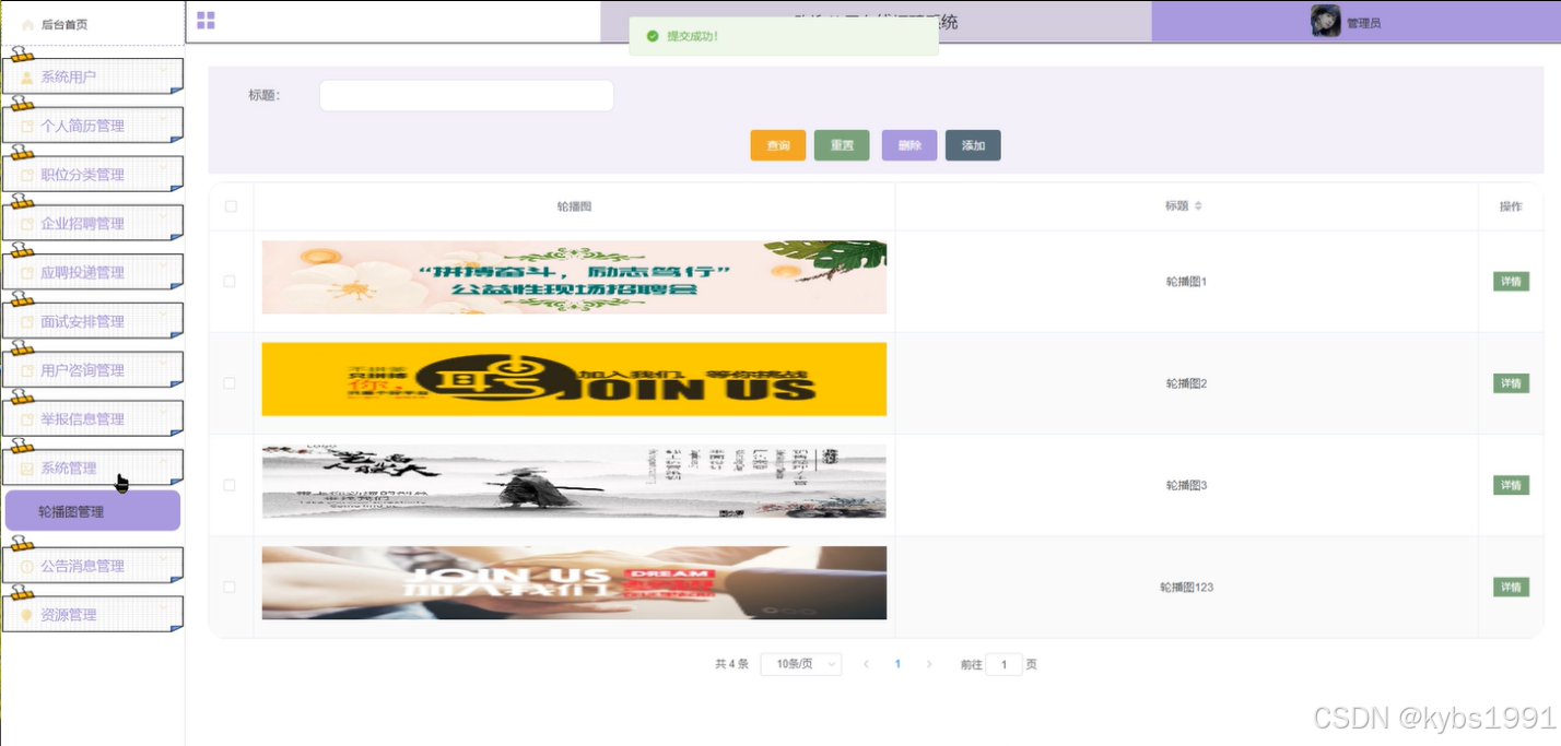 管理员点击“系统管理”这一菜单会显示轮播图这一个子菜单,管理员可以对前台展示的轮播图进行设置,界面如下图4-11所示。