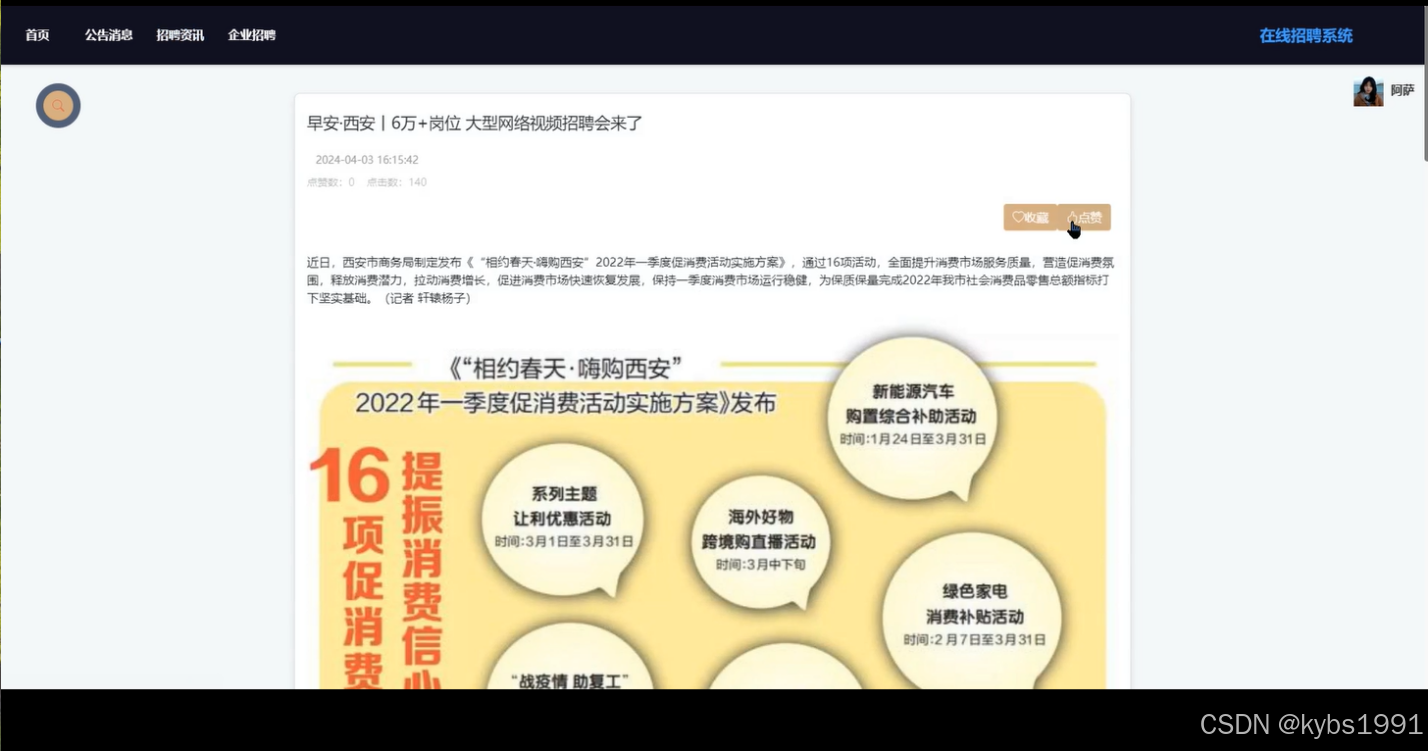 当用户点击“招聘资讯”后,用户可以在资讯详情页面查看、收藏、点赞、评论该资讯,界面如下图所示。