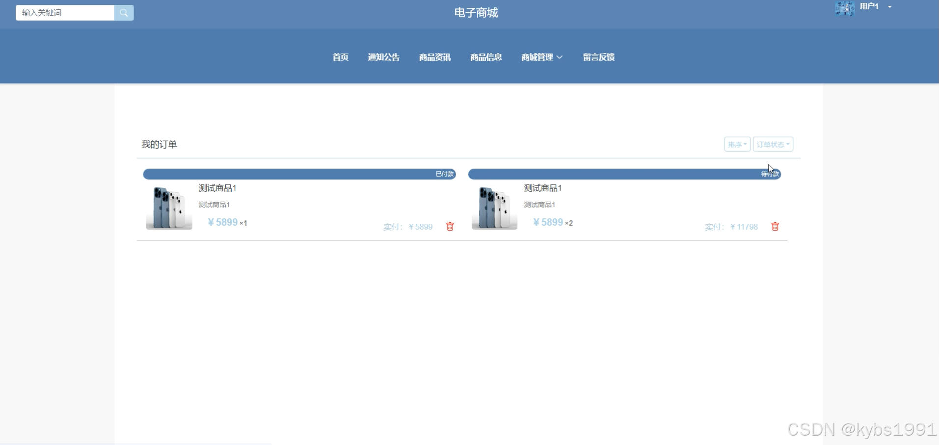 当用户点击“我的订单”页面支持排序或订单状态等进行搜索查询订单信息,对未支付的订单可进行在线支付,其界面如下图5-8所示。