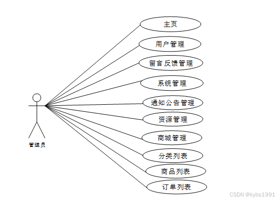 管理员是维护整个电子商城中所有数据信息的,管理员可以进行登录、用户管理(管理员、普通用户)、留言反馈管理、系统管理、通知公告管理、资源管理、商城管理等。管理员角色用例如图3-2所示。