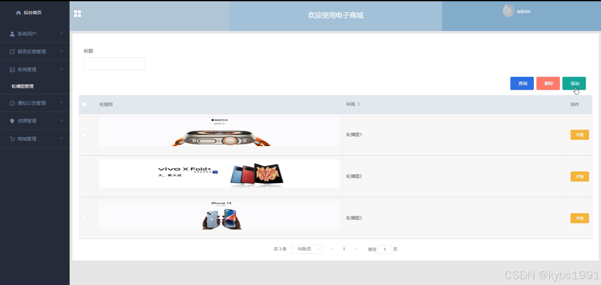 管理员在“轮播图管理”界面可以对轮播图进行查看和管理,在轮播图界面点击“添加”按钮进入添加页面,填写标题、上传图片即可完成轮播图的添加,还可以对轮播图进行查询、修改、删除操作。轮播图管理界面如下图5-11所示。