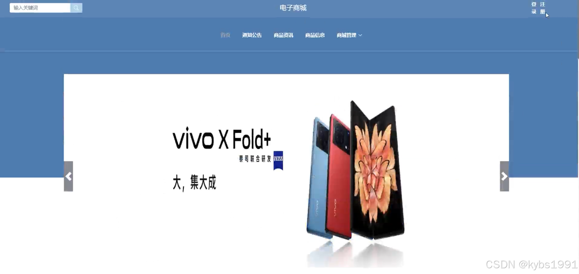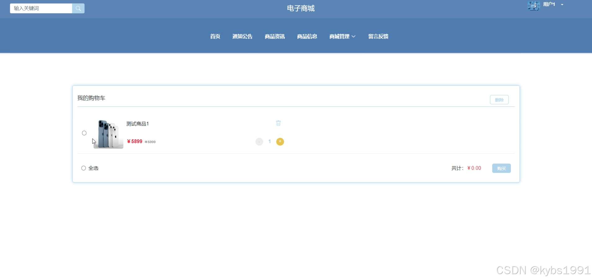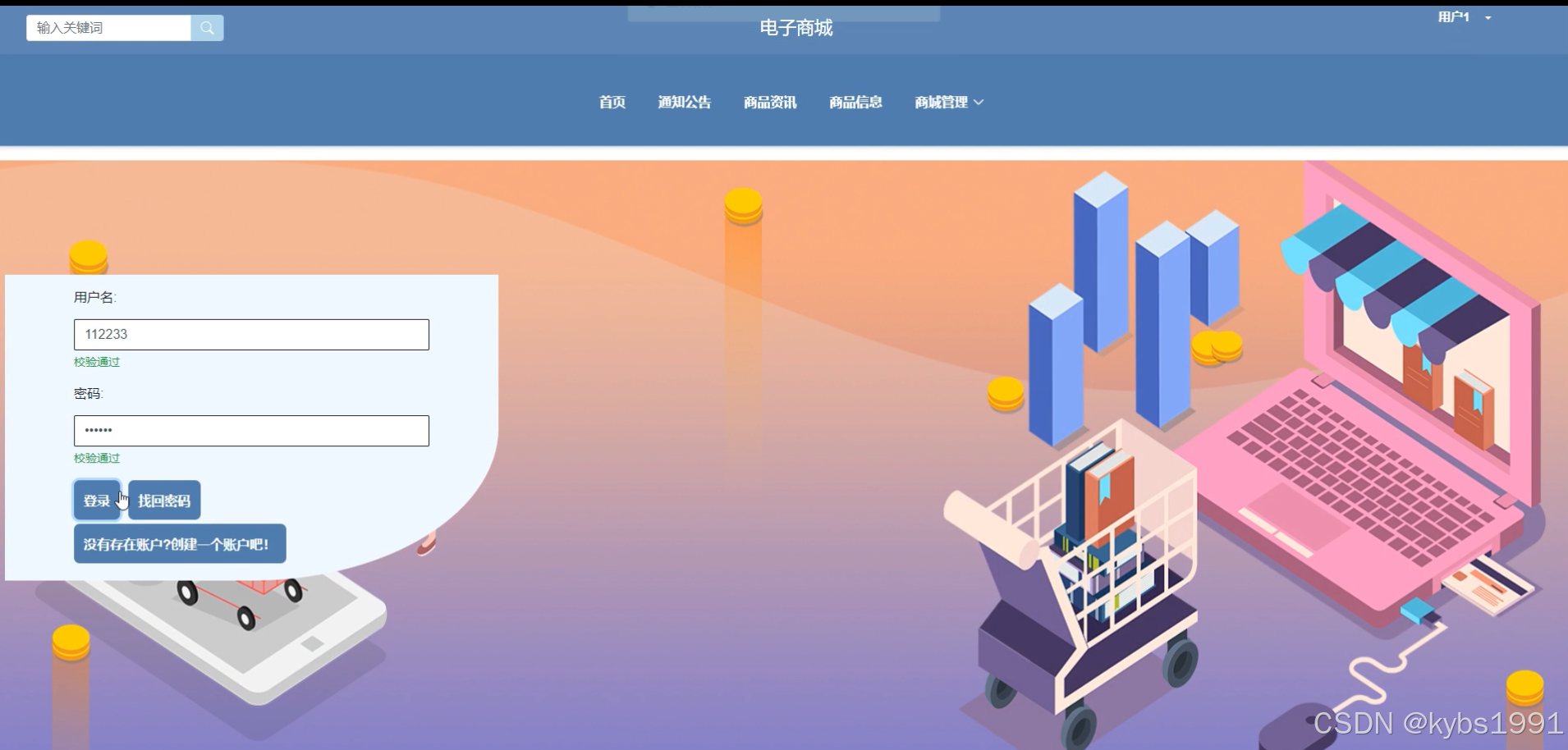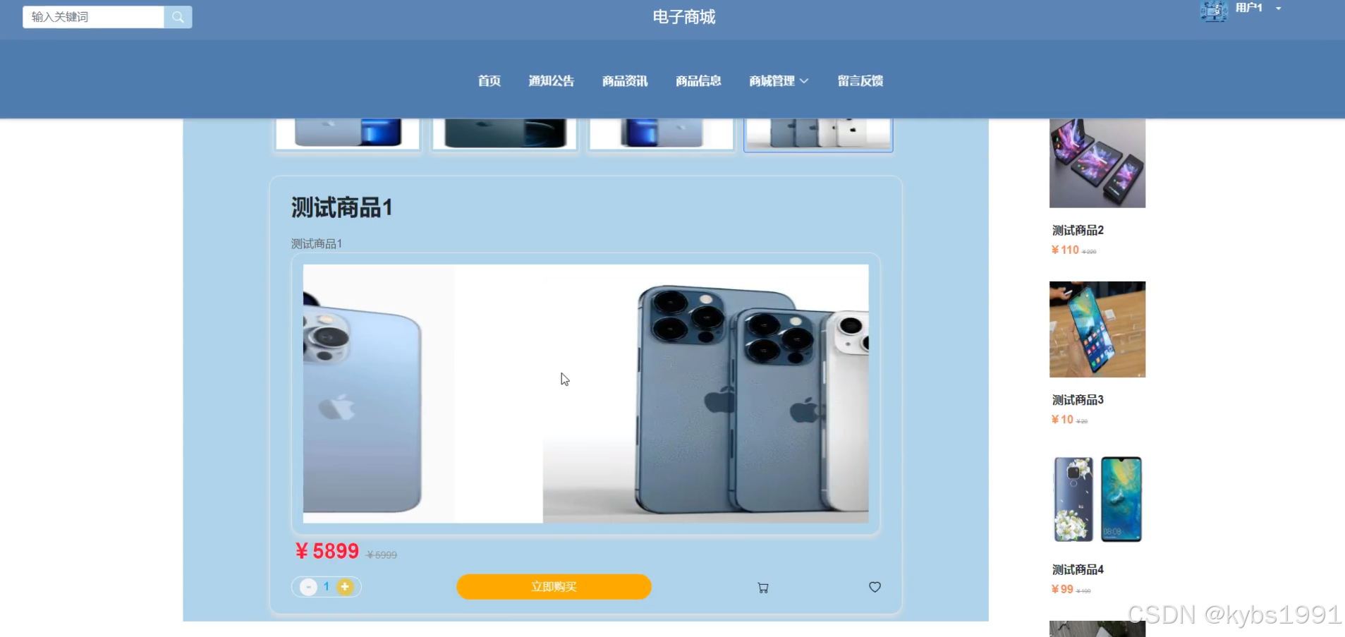 (2)查看电子商城的首页信息:电子商城的首页信息包含了首页、通知公告、商品资讯、商品信息、商城管理(我的订单、我的地址、我的购物车)、留言反馈、我的账户、个人中心(个人首页、留言反馈、收藏)等。