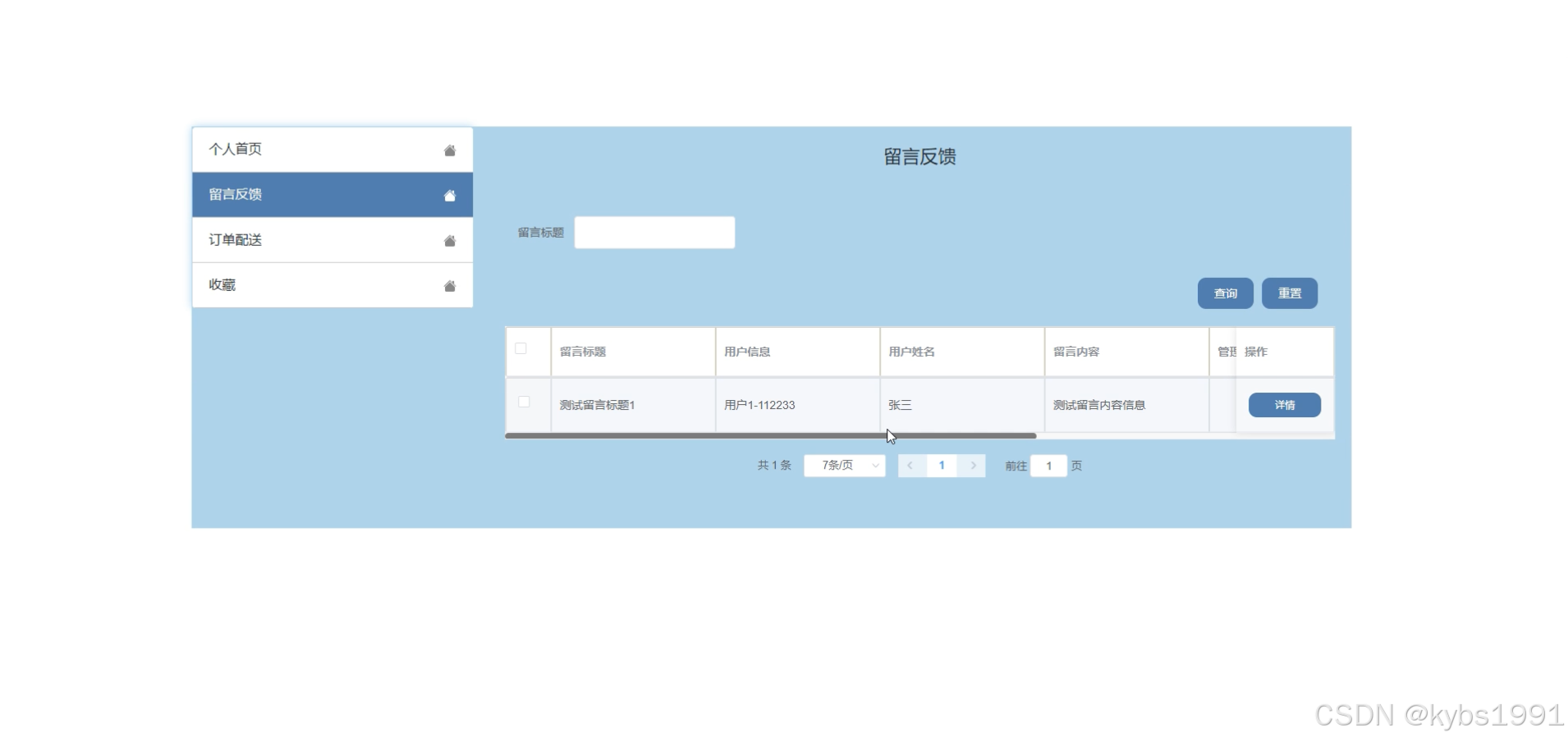 当用户点击首页右上方的“个人中心”后将会进入后台首页,可以查看个人首页、留言反馈、订单配送、收藏等信息。个人中心界面如下图5-5所示。