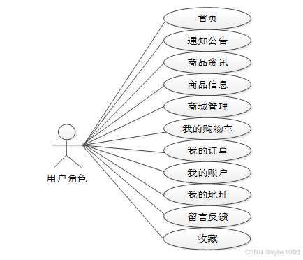 电子商城的完整UML用例图分别是图3-1、图3-2。在参与者上包括用户和管理员。前台上用户角色用例包括注册成为我们正式的用户、用户登录、通知公告、商品资讯、商品信息、商城管理(我的购物车、我的订单、我的地址)、我的账户(个人资料、个人首页、留言反馈、收藏)。用户角色用例如图3-1所示。