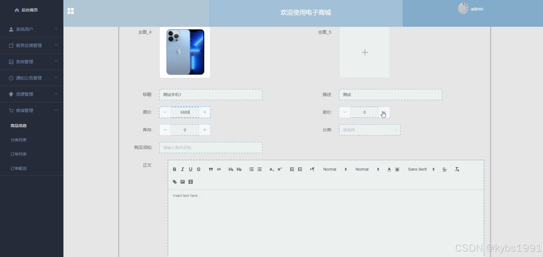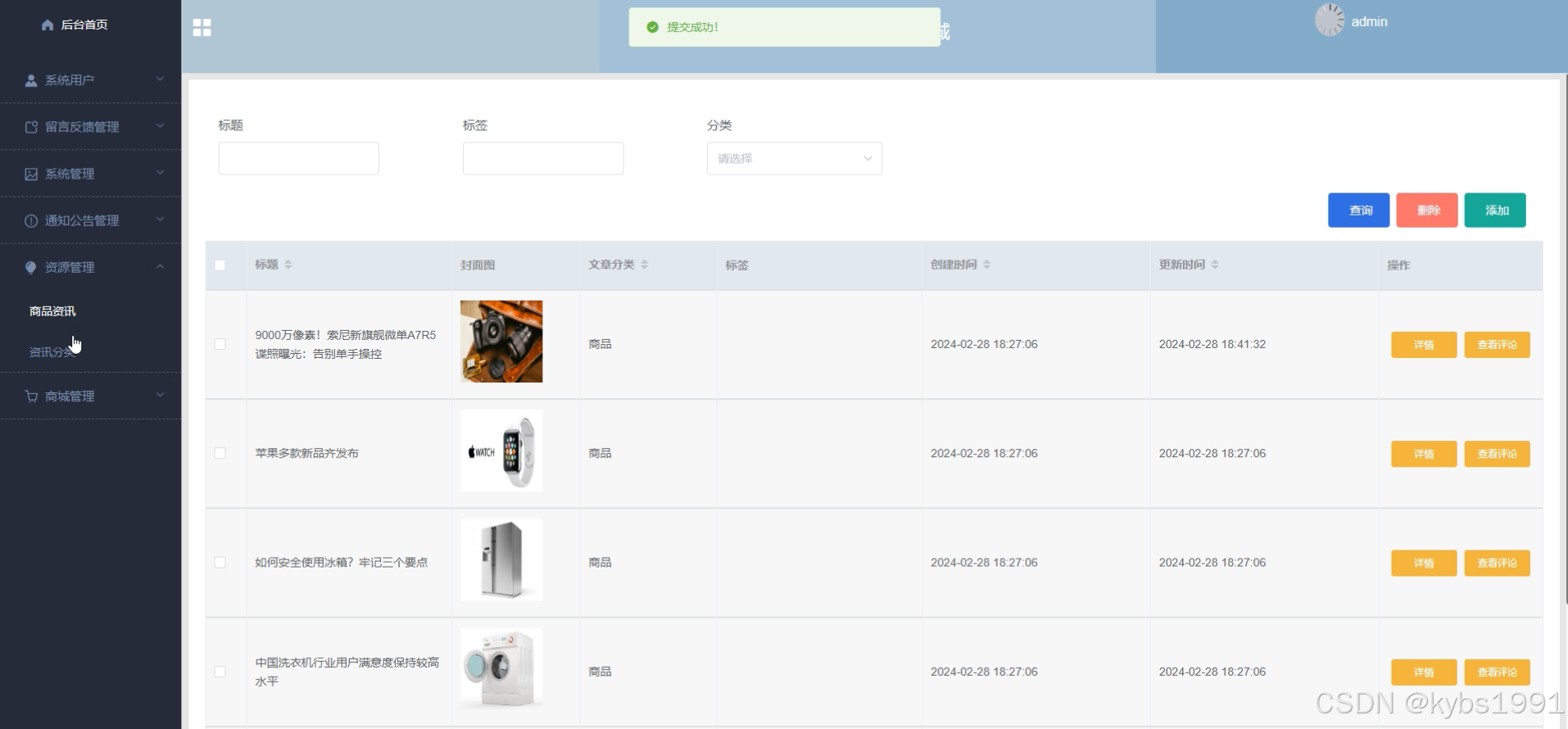 管理员在“资源管理”页面可对商品资讯以及商品分类进行维护管理,界面如下图5-13所示。