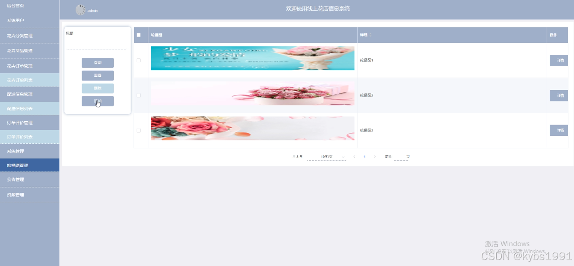 线上花店信息系统中的管理人员在“系统管理”这一菜单下是可以对线上花店信息系统内展示的轮播图进行添加修改的。系统管理界面如下图4-14所示。