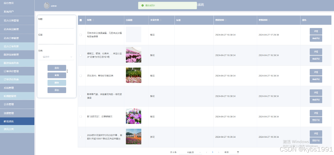 管理员点击“资源管理”可以对前台展示的鲜花资讯以及资讯所属分类进行管理,鲜花资讯管理的界面如下图4-15所示。