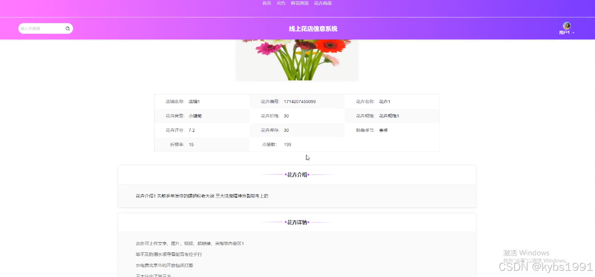 (5)花卉商品:花卉商品:用户可以查看花卉商品信息,在查询到自己想要了解的花卉商品的时候,可以进入查看详细的介绍包括店铺名称、花卉编号、花卉名称、花卉类型、花卉价格、花卉规格、花卉评分、花卉库存、销售季节、折损率、花卉介绍、花卉详情等信息。在花卉商品详情这个界面,同时支持用户对喜欢的物品信息进行下单、评论、点赞和收藏操作。