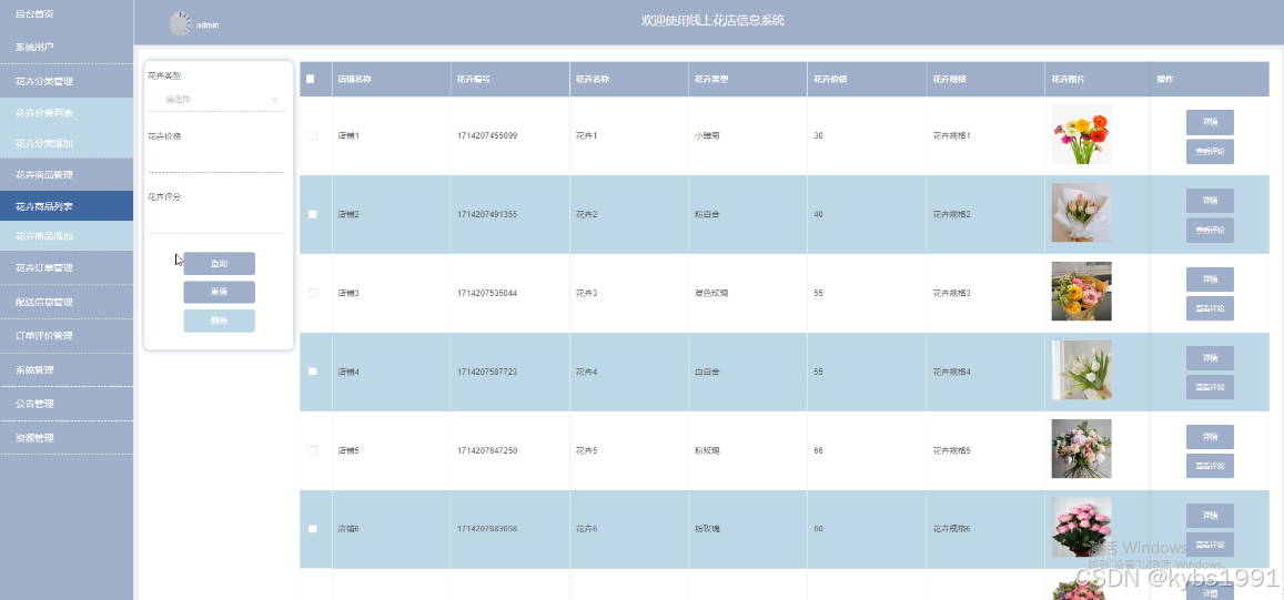 管理员点击“花卉商品管理”会显示出所有的花卉商品信息,支持输入花卉类型、价格或评分对花卉商品进行查询,也可以添加新的花卉商品,对花卉商品的评论进行管控。花卉商品管理界面如下图4-12所示。