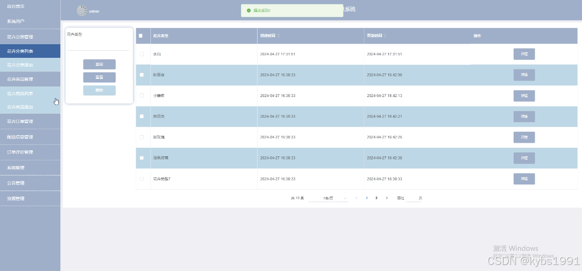 (3)花卉分类管理:管理员点击“花卉分类管理”菜单可以对花卉商品的分类进行增删改查。