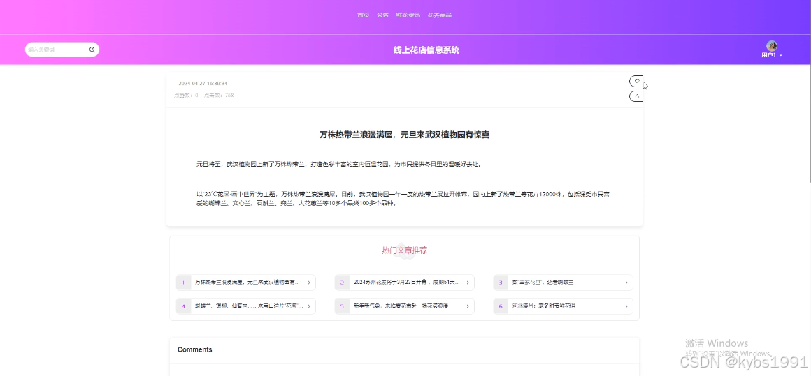 (4)鲜花资讯:当用户点击“鲜花资讯”这一菜单按钮,会显示管理员在后台发布的所有的鲜花资讯,可以查看详情,进行收藏、点赞、评论等。
