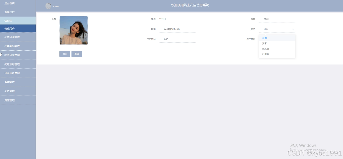 (2)系统用户:管理员可以对线上花店信息系统中的管理员和普通用户账户信息进行增删改查。