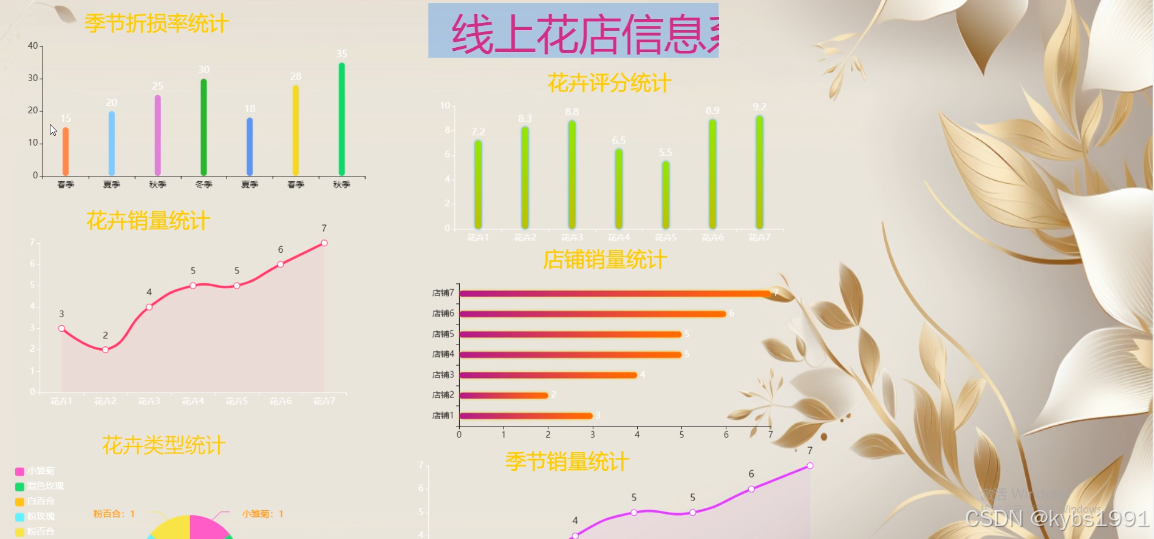 系统提供了数据大屏看板模块,展示季节折损率统计、花卉销量统计、花卉评分统计、店铺销量统计、花卉类型统计、季节销量统计等可视化图表,大屏界面如下图4-16所示。