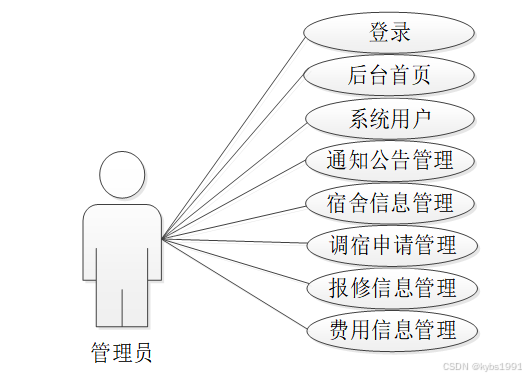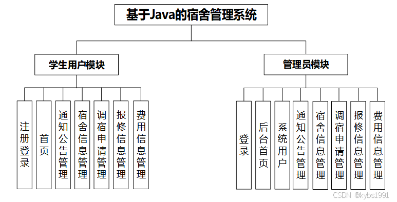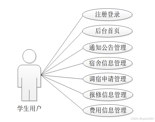 按照宿舍管理系统的角色,主要包括学生用户模块和管理员模块,其主要内容如下: