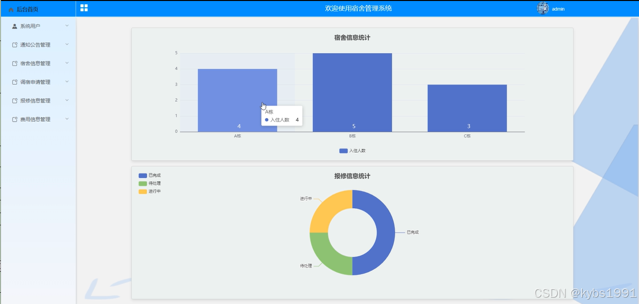 管理员在后台首页可以直观地查看宿舍信息的统计情况,包括宿舍的数量、类型等关键数据。同时,还可以快速浏览报修信息的统计表,了解当前的报修情况,如报修信息和处理进度等。这些统计信息有助于管理员全面了解宿舍管理情况,为决策提供数据支持。后台首页界面如下图所示。