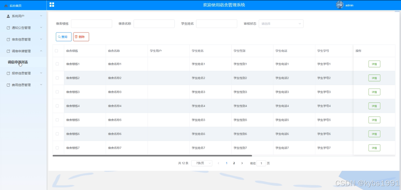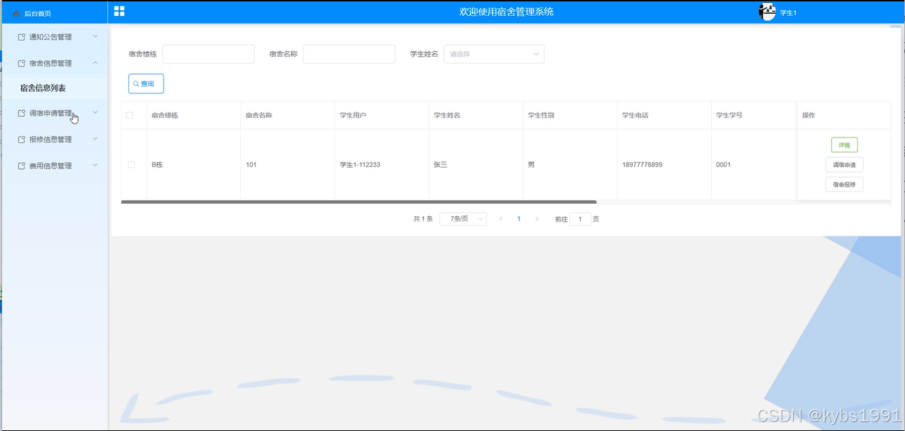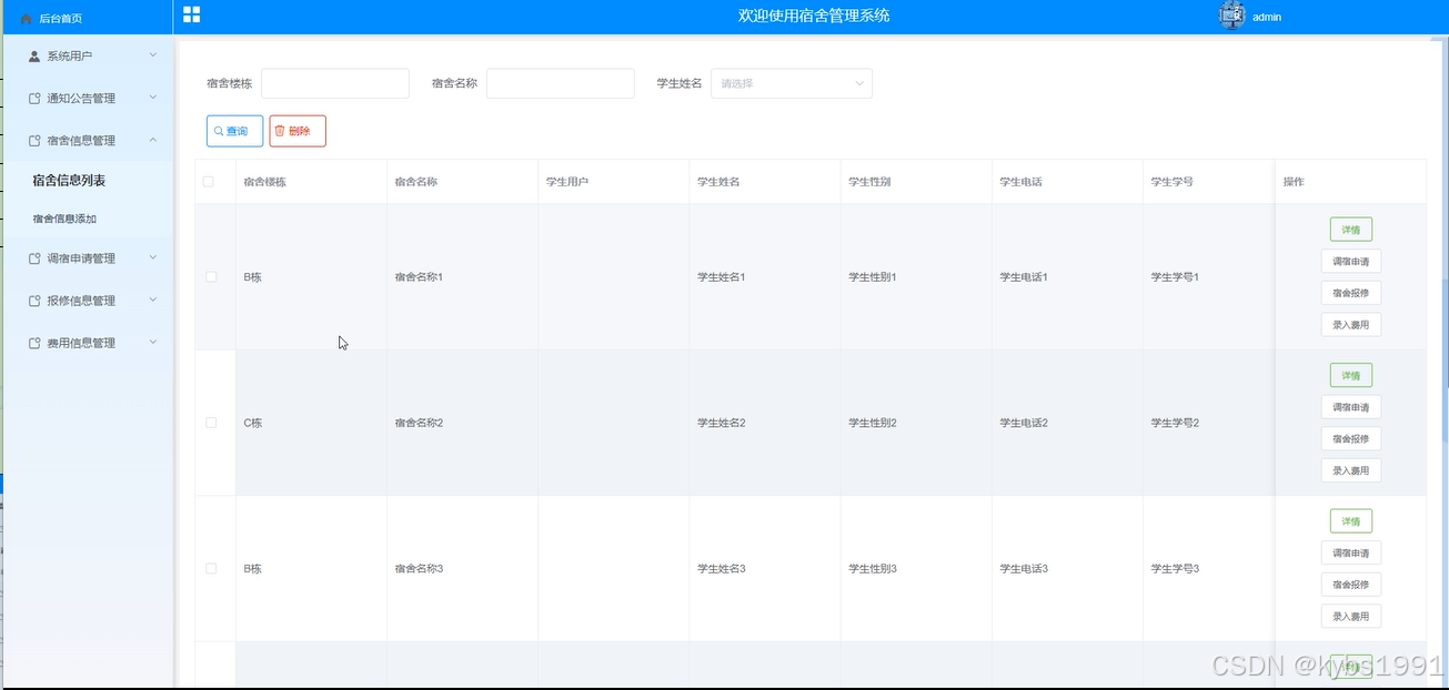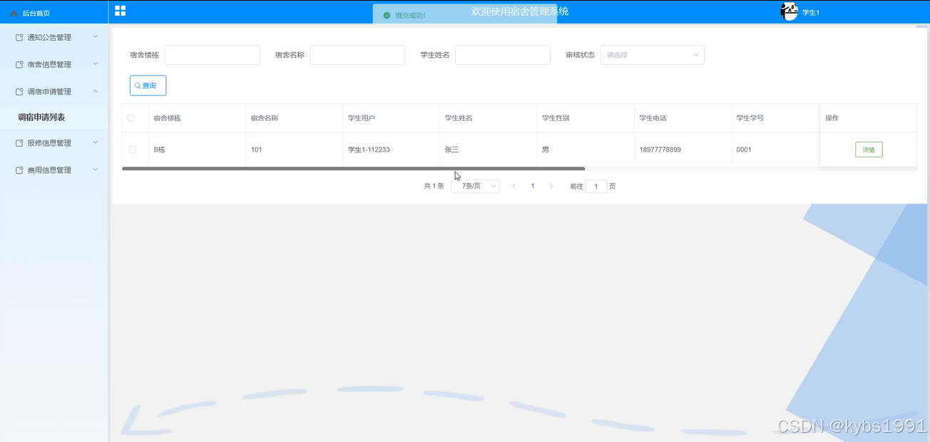 - 宿舍信息管理:学生用户能查看自己宿舍的详细信息,包括调宿申请、报修记录等。支持按宿舍楼栋、名称或学生姓名查询,便于快速定位宿舍信息。