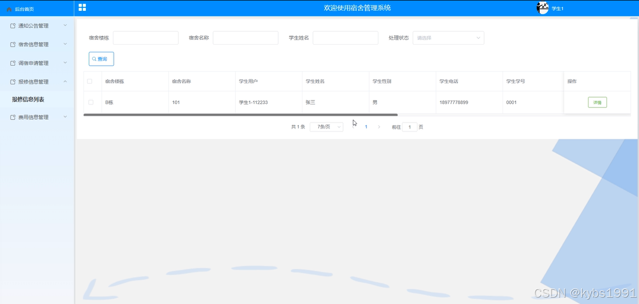 学生用户能查看自己宿舍的报修记录及处理状态,及时了解维修进度。支持多种查询方式,方便学生跟踪报修问题,报修信息管理界面如下图所示。