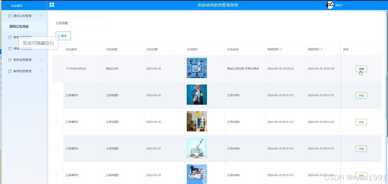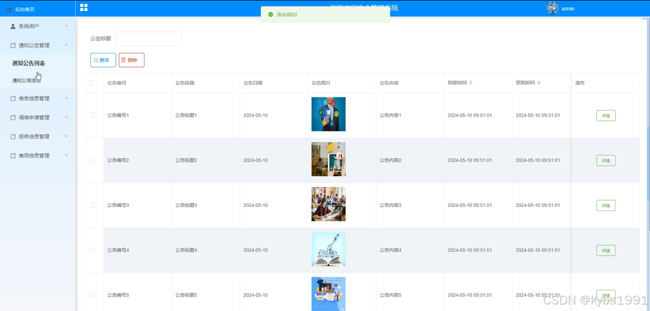 - 通知公告管理:管理员可以在后台方便地发布、查看、编辑和删除各类通知公告。通过公告标题进行搜索,可以快速定位到特定公告。这一功能有助于管理员及时传达重要信息,确保学生用户能够获取到最新的通知和公告。