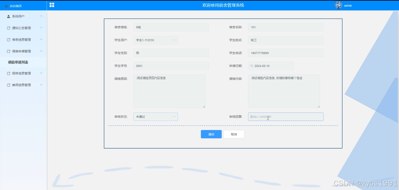 - 宿舍信息管理:管理员能够全面管理学生宿舍的信息,包括添加、查看和修改宿舍信息。对于学生提出的调宿申请,管理员可以进行审批,并根据需要修改宿舍信息。同时,管理员还可以处理宿舍报修事宜,录入相关费用信息,确保宿舍的正常运行和维护。