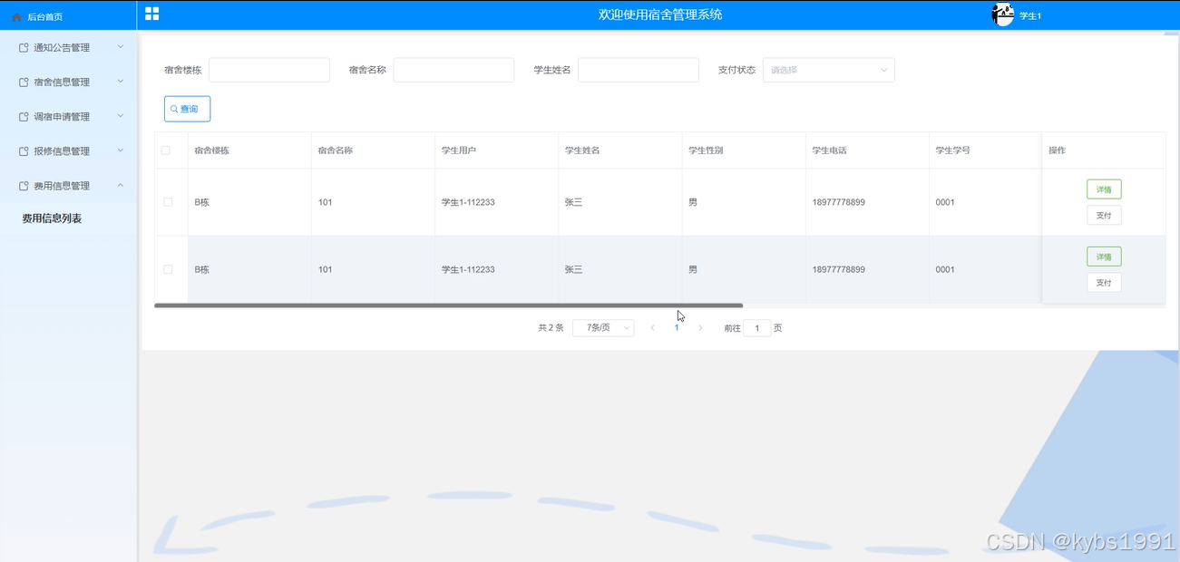 - 费用信息管理:管理员能够查看并管理学生宿舍的报修费用信息,包括费用的产生、支付状态等。通过筛选条件,如宿舍楼栋、宿舍名称、学生姓名和支付状态等,管理员可以方便地查询和定位特定的费用记录。此外,管理员还可以对学生的宿舍报修费用支付进行相关信息操作,确保费用管理的准确性和高效性。