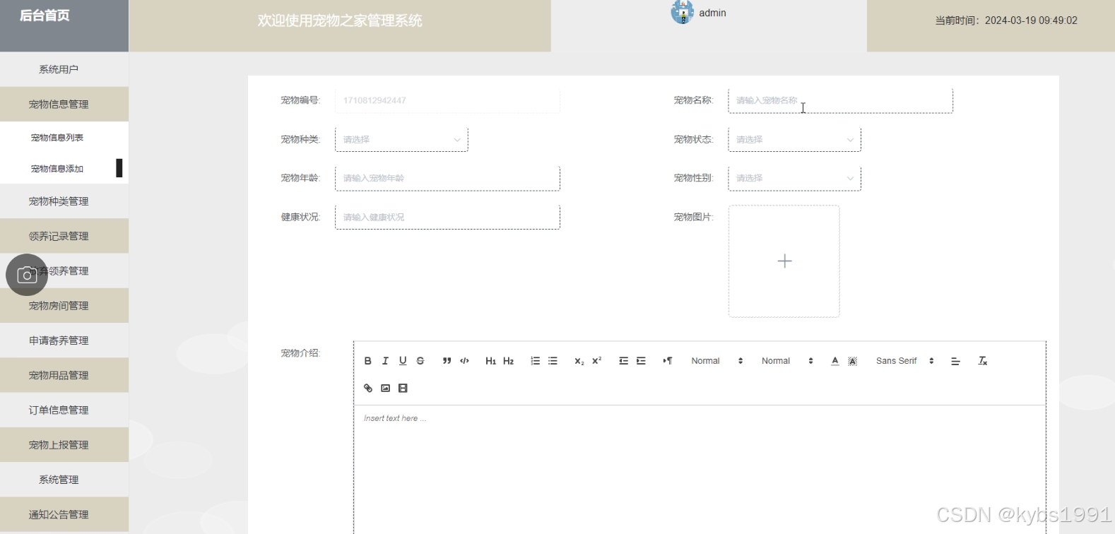 - 宠物信息管理:管理员可以对宠物信息列表和宠物信息添加两个子菜单进行管理,可以进行增删改查操作。