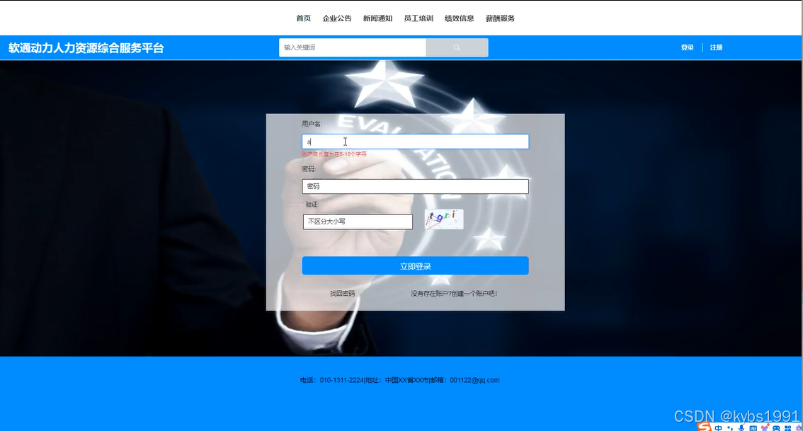 基于SSM的软通动力人力资源综合服务平台中的注册后的用户是可以通过自己的账户名和密码进行登录的,当用户输入完整的自己的账户名和密码信息并点击“登录”按钮后,将会首先验证输入的有没有空数据,再次验证输入的账户名+密码和数据库中当前保存的用户信息是否一致,只有在一致后将会登录成功并自动跳转到基于SSM的软通动力人力资源综合服务平台的首页中;否则将会提示相应错误信息,用户登录界面如下图4-2所示。