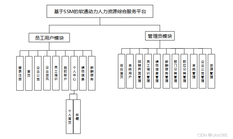 按照基于SSM的软通动力人力资源综合服务平台的角色,系统划分为了员工用户模块和管理员模块这两大部分。