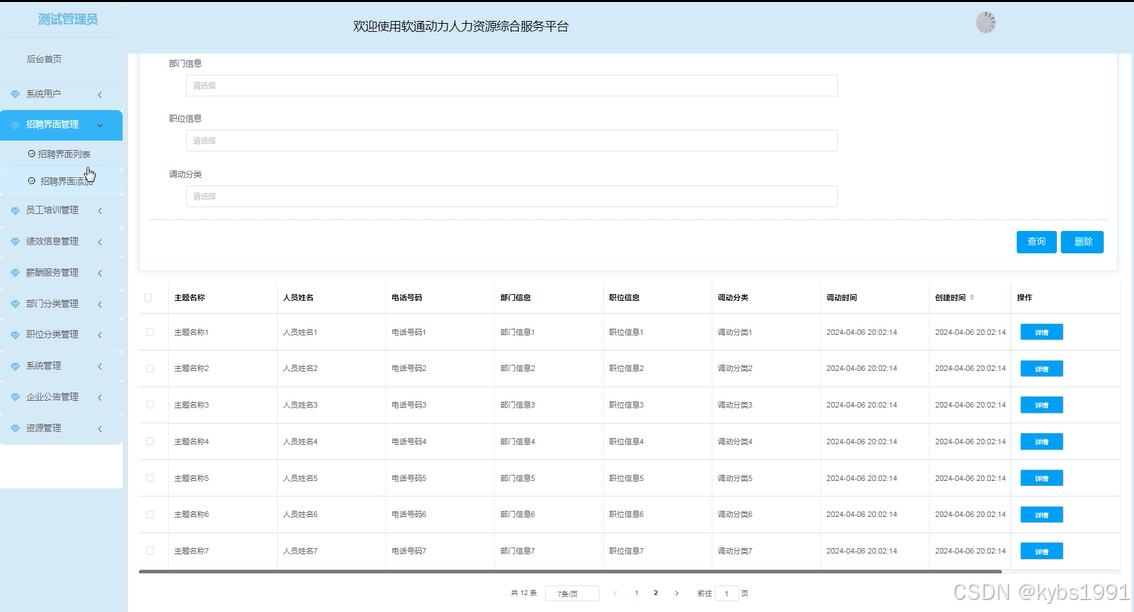 当管理员点击“招聘界面管理”这一菜单的时候可以管理招聘界面信息,包括部门信息、职位信息、调动时间等。招聘界面管理界面如下图所示。