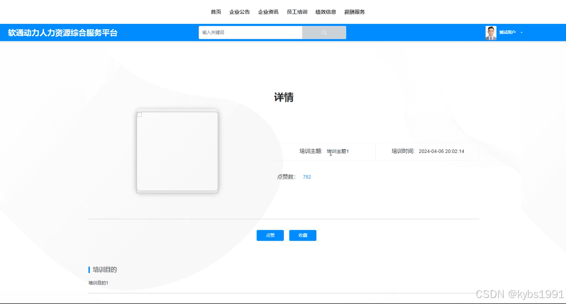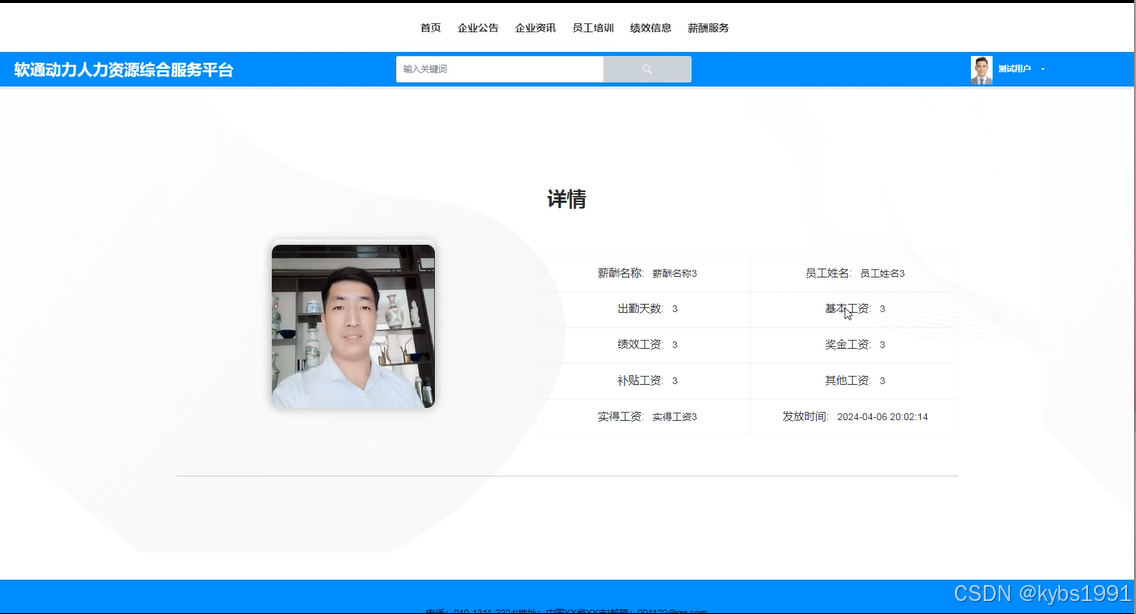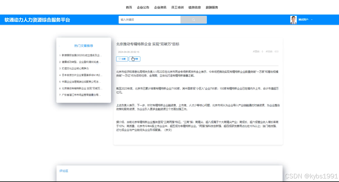 The platform is mainly divided into two roles: employee user and administrator. Employee users can log in and register, view company announcements and information, participate in employee training, view performance information and salary services, as well as manage personal accounts and personal centers through the platform. Administrators have more comprehensive backend management functions, including system user management, recruitment interface management, employee training management, performance information management, salary service management, department classification management, position classification management, system management (such as carousel management), enterprise announcement management, and resource management (such as enterprise information and information classification management).