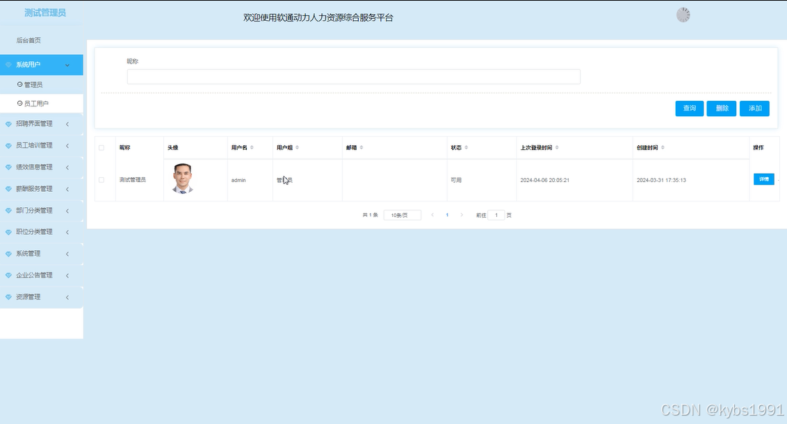 基于SSM的软通动力人力资源综合服务平台中的管理人员是可以对注册的员工用户进行管理的,也可以对管理员进行管控。界面如下图4-7所示。
