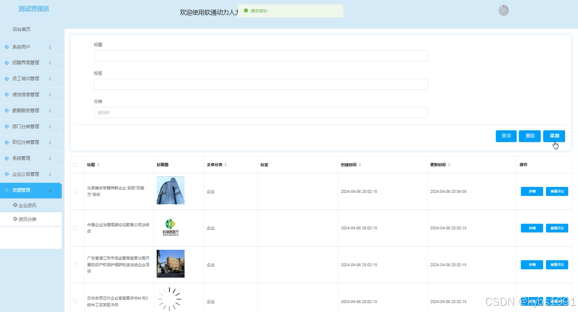 当管理员点击“资源管理”这一菜单的时候,会出现企业资讯+资讯分类这两个子菜单,可以对这两个模块进行增删改查操作。资源管理界面如下图所示。