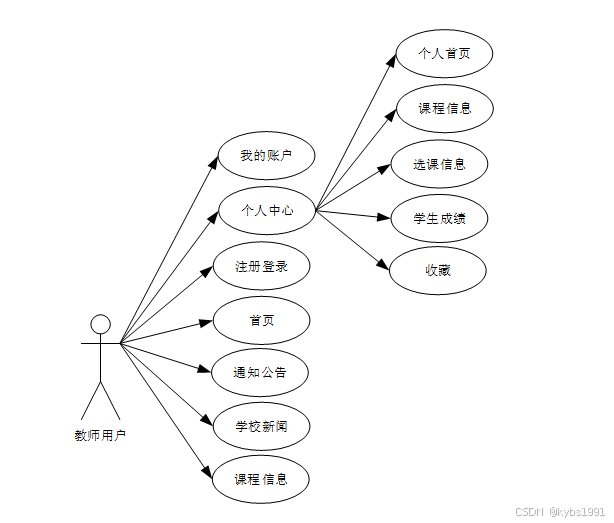 教师用户模块功能有:我的账户、个人中心(个人首页、课程信息、选课信息、学生成绩、收藏)、首页、通知公告、学校新闻、课程信息。