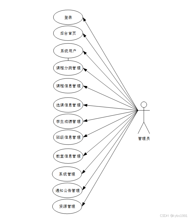 管理员模块功能有:系统用户、课程分类管理、课程信息管理、选课信息管理、学生成绩管理、班级信息管理、教室信息管理、系统管理、通知公告管理、资源管理。