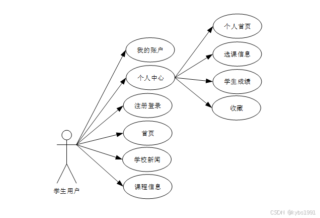 学生用户模块功能有:我的账户、个人中心(个人首页、选课信息、学生成绩、收藏)、首页、通知公告、学校新闻、课程信息。