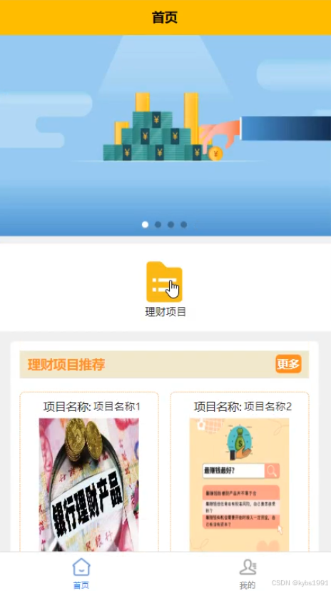 (2)首页:当用户进入家庭理财管理APP的时候,首先映入眼帘的是系统的导航栏包括:首页(理财项目)、我的(基本信息、收藏、统计图、家庭支出、家庭收入、理财购买、盈亏情况、理财卖出)等内容。